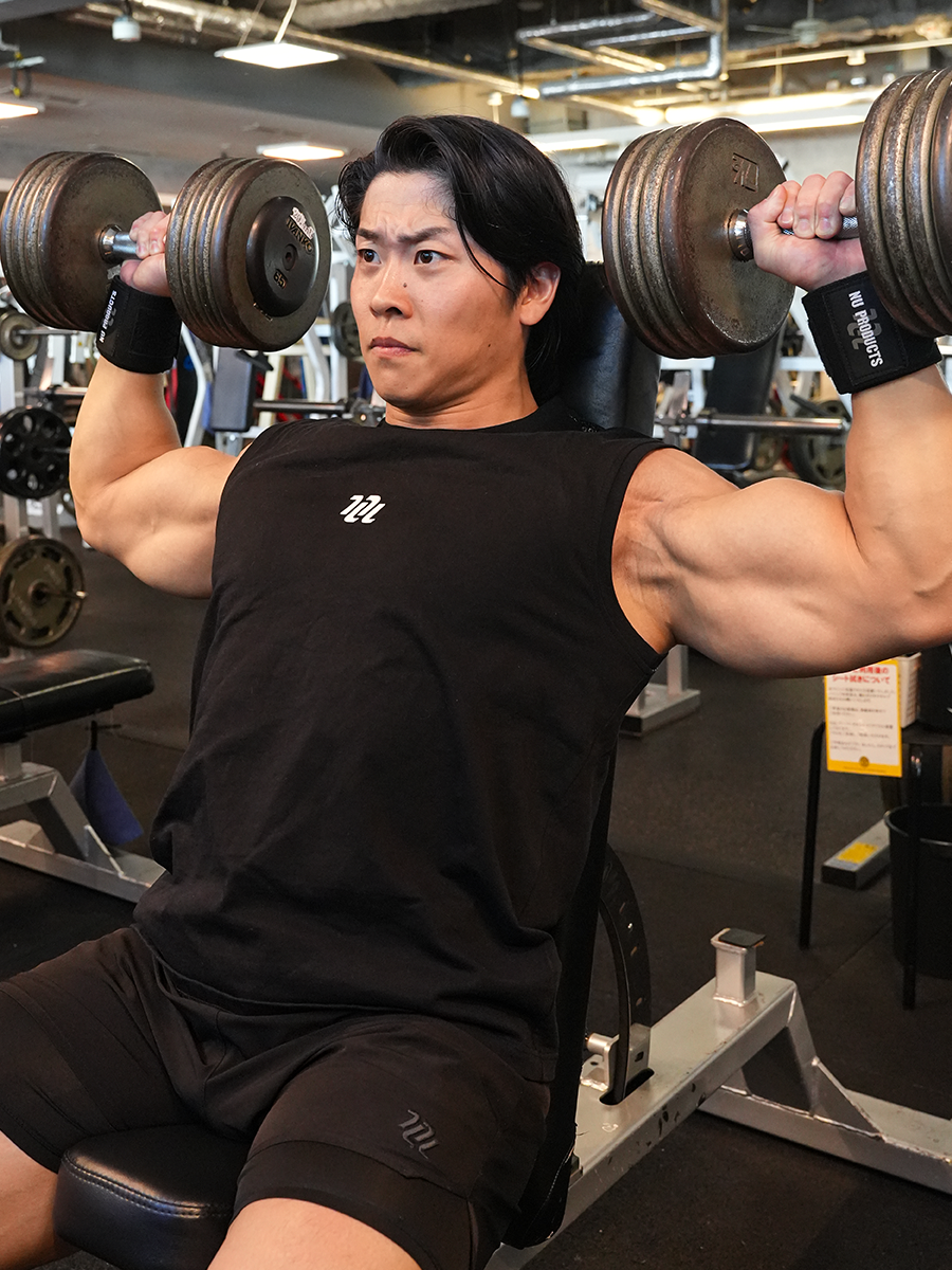 高重量のプレス系ではしっかり固定、ボリューム種目では少しゆるめに。
